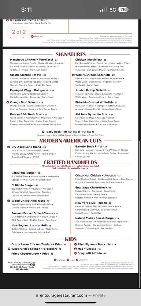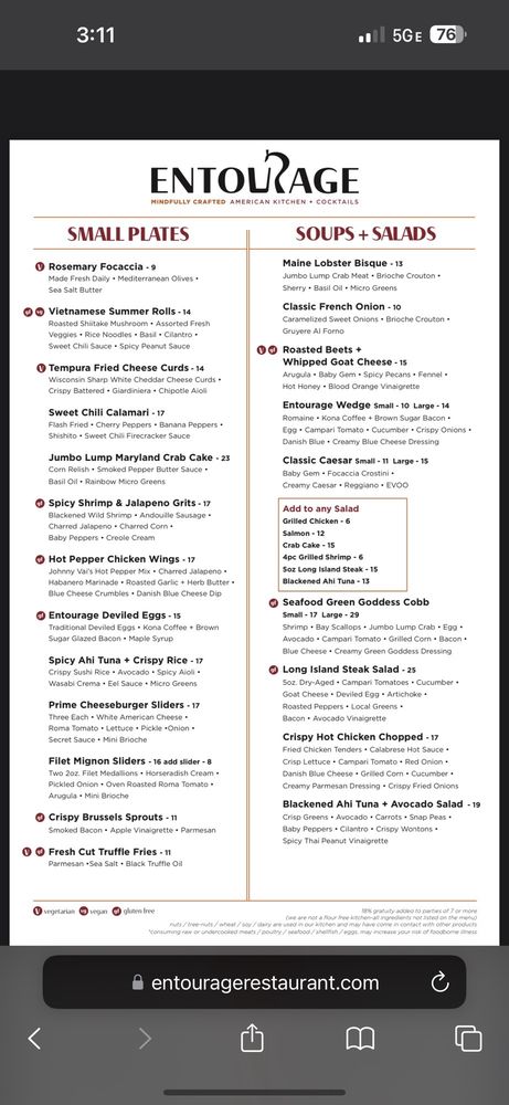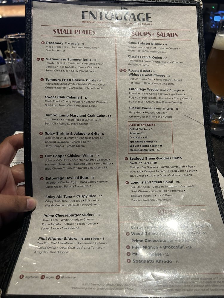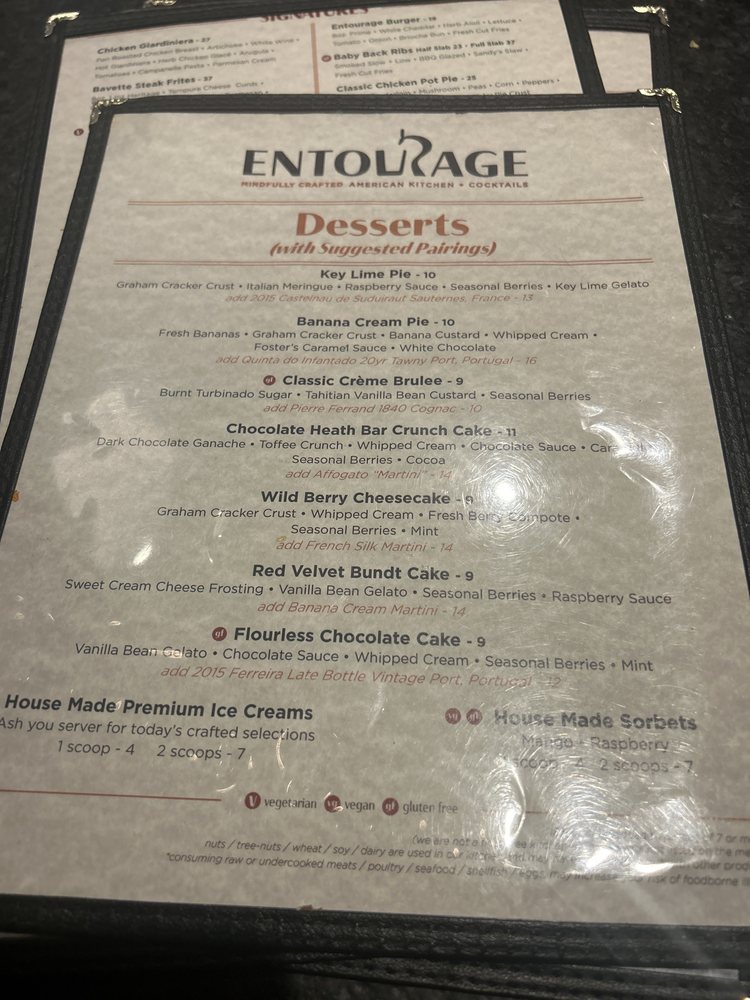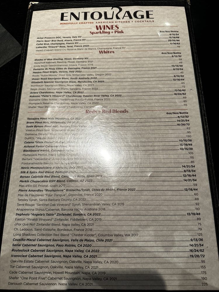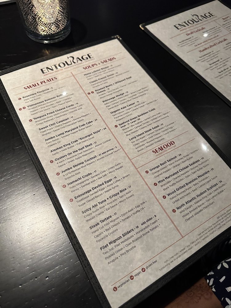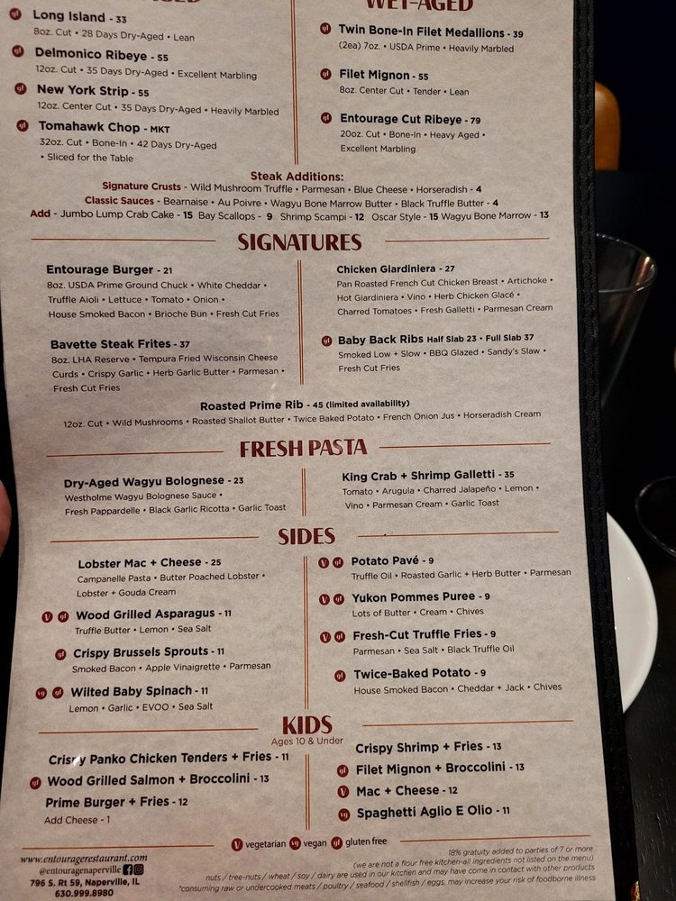 "Entourage" in Naperville, IL is a top-notch American restaurant that excels in steakhouses and seafood. With a wide range of utilities including reservation options, delivery, and takeout, they cater to all needs. The menu boasts delicious dishes like ahi tuna and dry-aged ribeye, alongside cocktails like bourbon flights. The ambiance is cozy yet modern, with attentive service from knowledgeable staff. Customers rave about the lobster bisque and the filet mignon, emphasizing the quality of the food. The restaurant provides a comfortable setting for gatherings, with options for private dining and outdoor seating. Overall, "Entourage" is a must-visit spot for fantastic food, speedy service, and a great atmosphere.